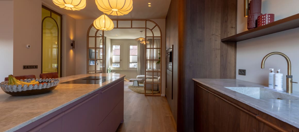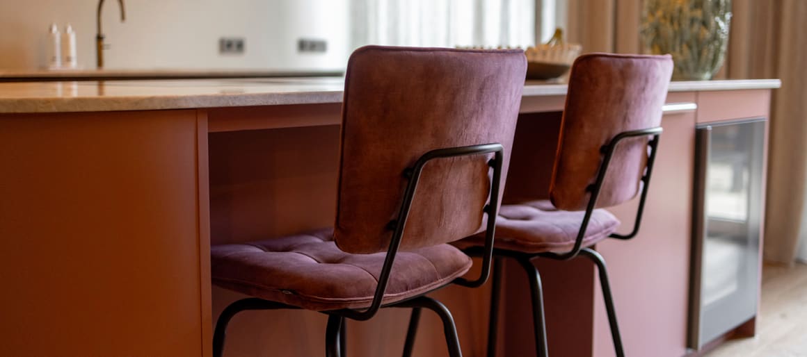 In deze verbouwing combineert styliste Laura speelse kleuren en vormen met verfijnde, chique accenten. De bordeauxrode velvet barstoelen van Manou sluiten met hun speelse design en zachte glans prachtig aan bij de luxe en warme uitstraling van de kastjes. Het resultaat is een stijlvolle en uitnodigende leefkeuken waarin moderne en authentieke stijlelementen elkaar aanvullen en waarin volop genoten kan worden!