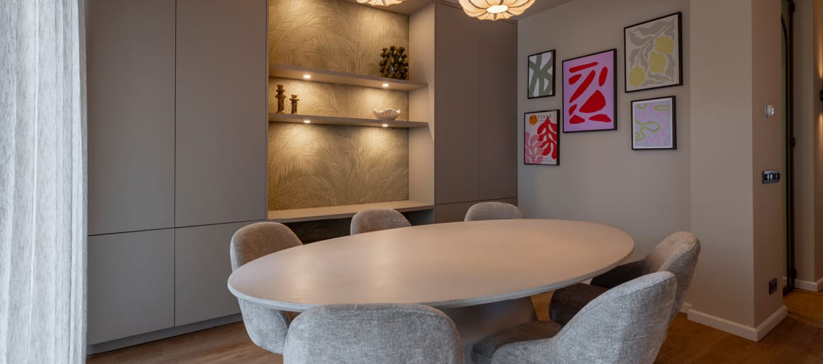Het gezin ontvangt graag familie en vrienden, dus een gezellige eethoek mag natuurlijk niet ontbreken. Ze hadden al een tafel, dus was het aan styliste Laura om de perfecte stoelen te vinden. Ze kiest voor stoel Nikolas, die niet alleen een subtiele glans heeft, maar dankzij de champagnekleur en het speelse, open design perfect past bij de luxe uitstraling van de tafel en rest van het interieur. Bovendien is de stoel draaibaar en heeft hij een terugdraaifunctie, wat het makkelijker maakt om in en uit de stoel te komen.