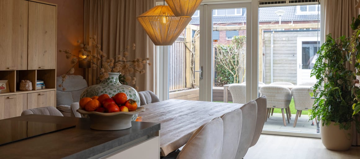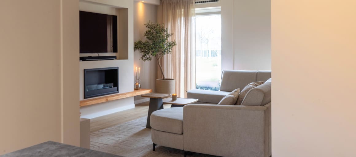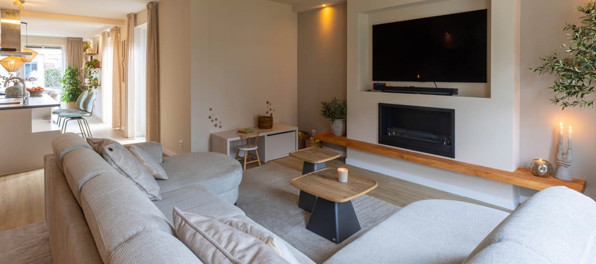 Ook voor de zithoek kiest Laura lichte kleuren. Op de grote beige hoekbank Alcona, met mooie, afgeronde vormen, is er plek voor het hele gezin om gezellig samen te zitten. De rest van de zithoek wordt gekenmerkt door het gebruik van hout, decoratie met organische vormen en aardse accenten. De salontafels Oskar hebben ook een warme houtlook, maar zijn gemaakt van onderhoudsvriendelijk Primo Laminato (HPL), waardoor ze makkelijk afwasbaar zijn – wel zo handig!