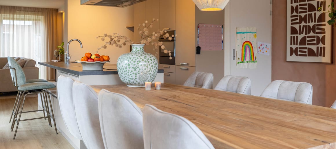 Om het interieur een knusse sfeer te geven, maakt styliste Laura voor deze make-over gebruik van lichte aardetinten en natuurlijke vormen. De organische boomstamvorm van de warme kikarhouten tafel Living, gecombineerd met de lichte kiezelkleur van de Bell-stoelen, zorgt voor een prachtig, natuurlijk geheel. Met acht zitplekken is er voldoende ruimte voor iedereen, en door de pocketvering in de draaibare stoelen wordt het heerlijk comfortabel tafelen voor het gezin!