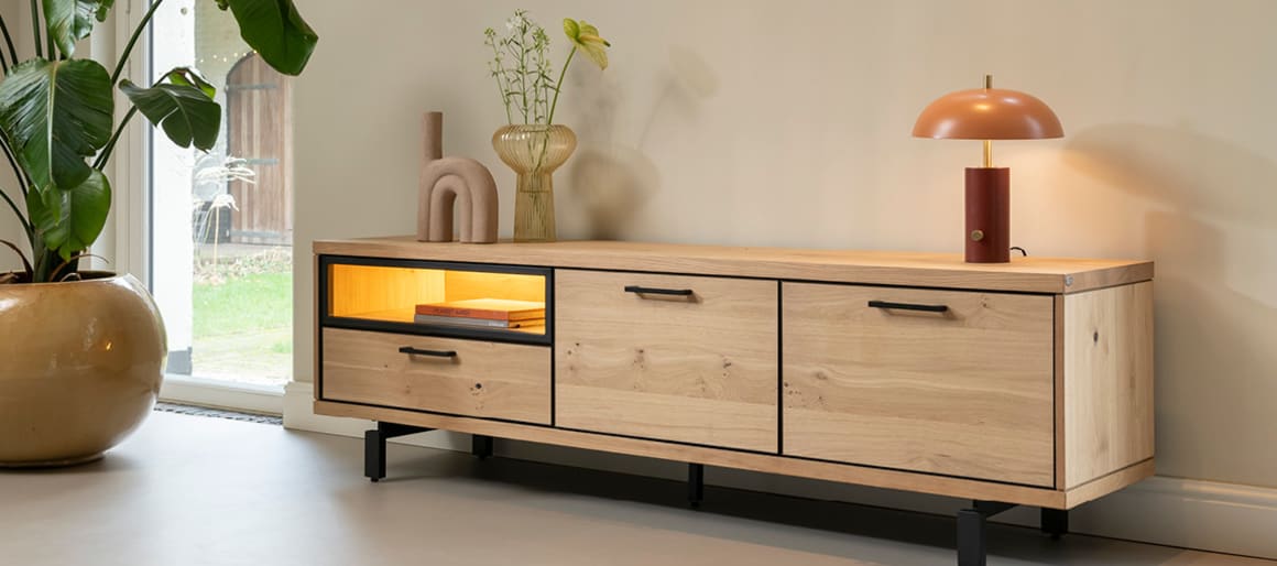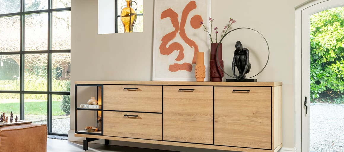 De natuurlijke eikenhoutkleur van deze collectie zorgt voor warmte en geeft een moderne naturel-sfeer, maar de kastmeubelen zijn wel strak en hoekig. Daarom is decoratie met organische, bijvoorbeeld ronde vormen altijd een goed idee om die strakheid te doorbreken. Zeker wanneer je bijvoorbeeld ronde decoratie-objecten in groepjes plaatst, geeft dit een speels effect. Om de ruimte extra gezellig te maken, kun je gebruik maken van de vitrinekast om je decoratie in te plaatsen. De ingebouwde ledverlichting en het gerookt glas zorgen voor een gezellige, warme uitstraling.