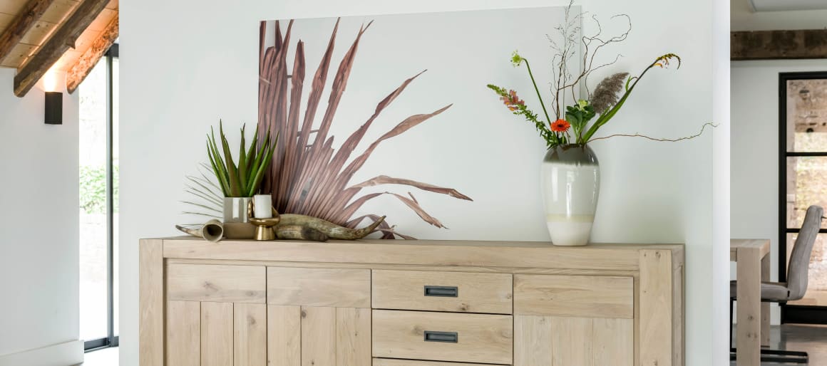 1. Grote decoratiestukken doen je meubels extra opvallen, zelfs een bijzettafeltje kan je extra aankleden!