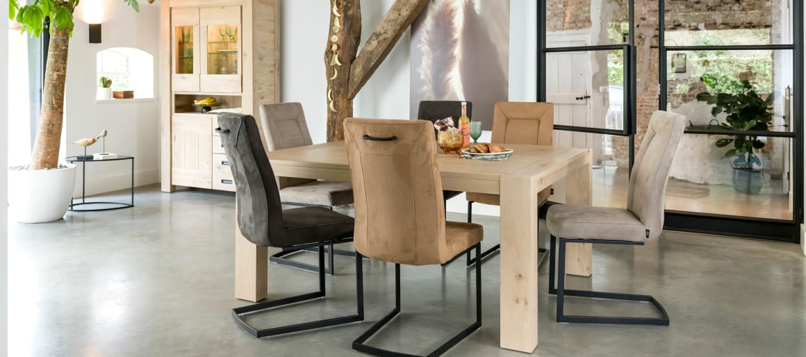 Massief hout en leder zijn een prachtige combinatie. Vooral een donkere lederkleur zal de meubels uit de Santorini collectie helemaal tot hun recht laten komen. Toch liever een wat zachter materiaal dan leder?  Dan kun je ook altijd kiezen voor een neutrale stof in een grijstint of lichte tint